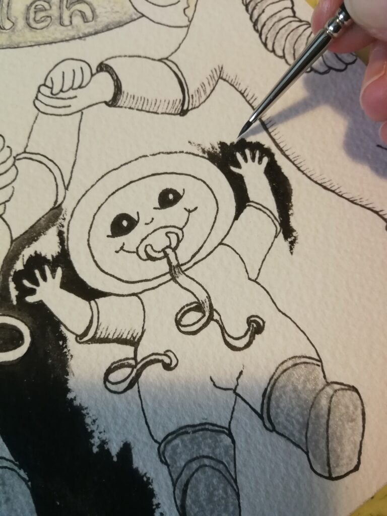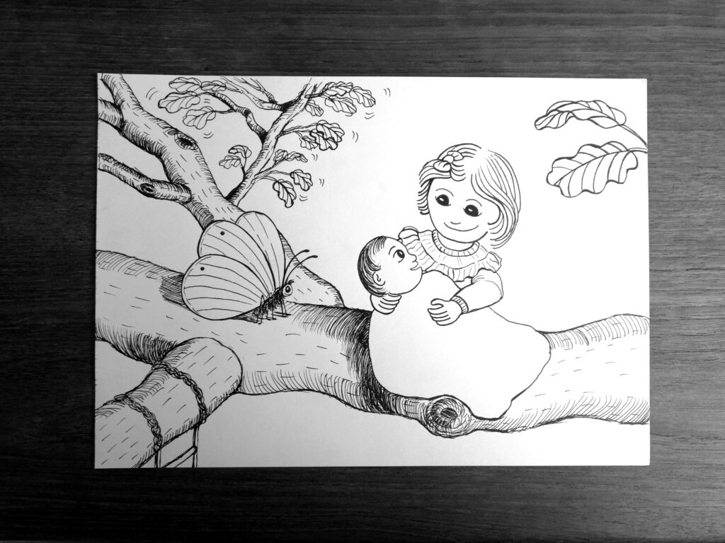 Jeg ser hurtigt hvordan billedet skal komponeres i hovedet, det er ofte i baldfolkstil, som små mennekser ikke større end mus! Er det et søskende portræt, bruger jeg min erfaring som børnefotograf til at “placere” børnene, så billedet bliver harmonisk! Har du ønsker til dyr der skal optræde på tegningen, eller et særligt tøjdyr, er det netop muligt at tegne med på tegningen.