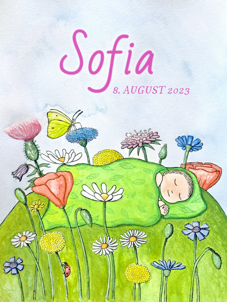 Du vælger en af mine dåbstegninger (fra kataloget) i A4 eller A3 og så skriver jeg navn, dato eller andet du kunne tænke dig…
