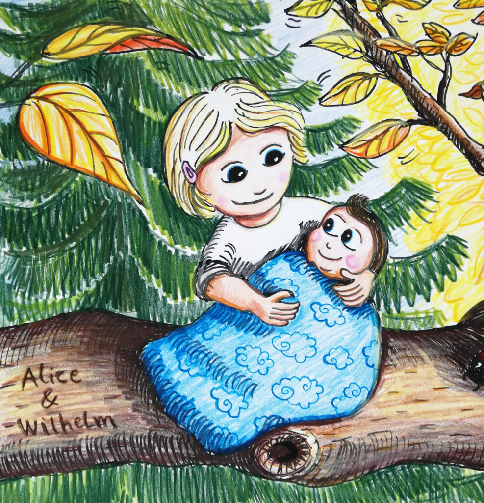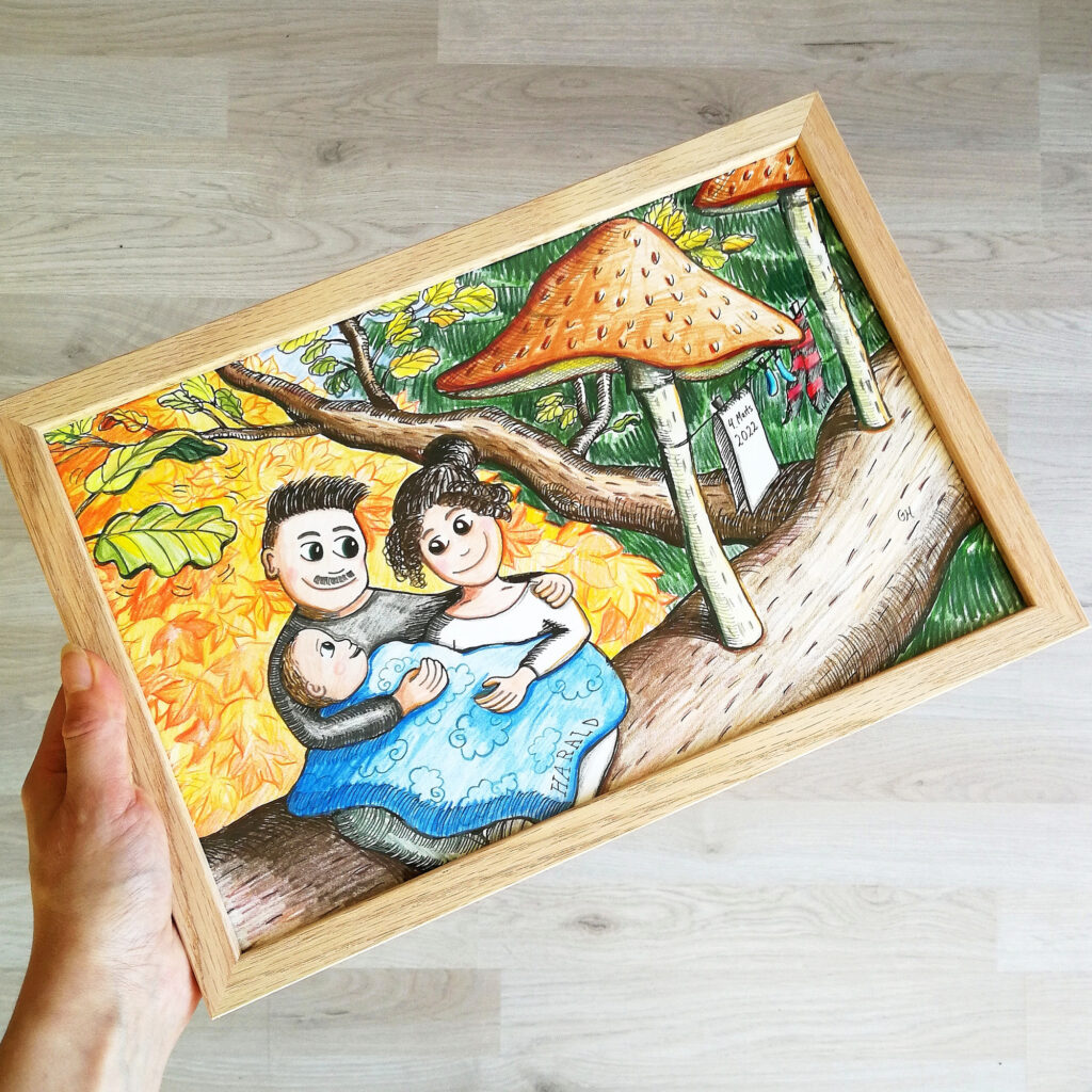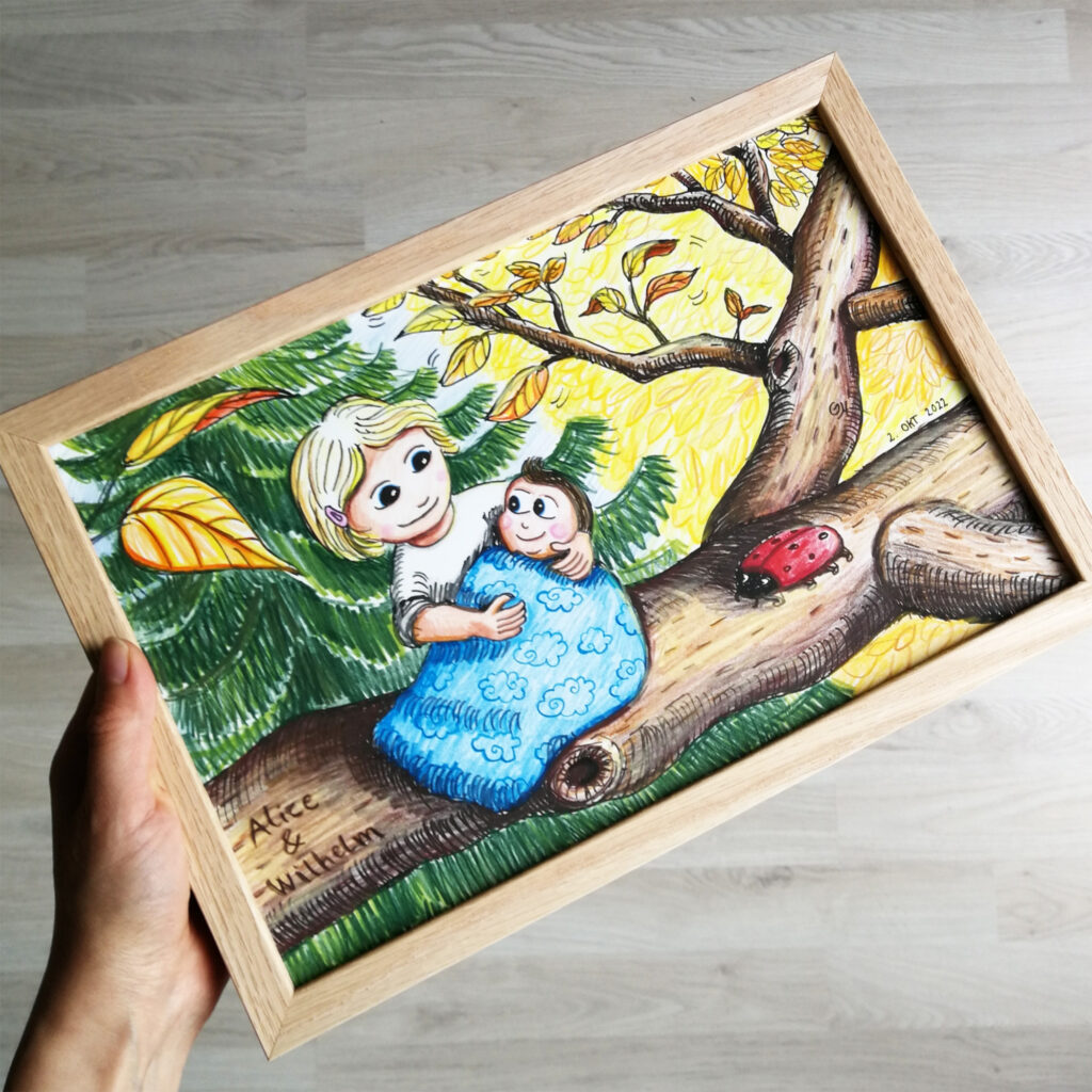 I dåbs-, søskende- og familie-portrættet, medtager jeg detaljer som er specielle for jeres familie! Har din datter en yndlingskjole tegner jeg hende med den, skal lillebrors puttedyr med og måske et sødt lille pindsvin eller en sommerfugl… Datoer og navne tegnes ind på en unik og sjov måde, og tegningen håndsigneres. Der er massere af muligheder og sjove idéer modtages gerne.