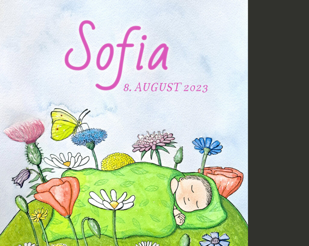 Du vælger en af mine dåbstegninger (fra kataloget) i A4 eller A3 og så skriver jeg navn, dato eller andet du kunne tænke dig…